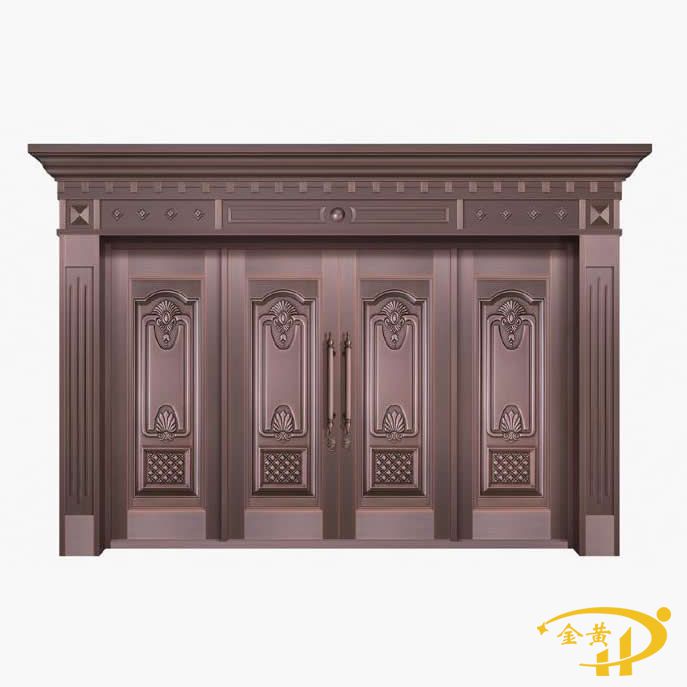 本款別墅四開銅門,型號是M-9163,門面采用整板模壓工藝,原材料為洛陽純紫銅或黃銅制作而成。