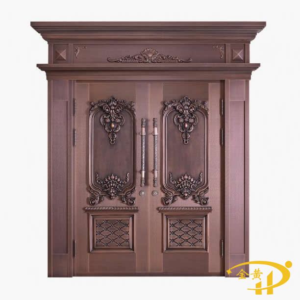 本款豪華別墅雙開門,型號是M-9028,門面采用精雕木紋工藝,原材料為洛陽純紫銅或黃銅制作而成。