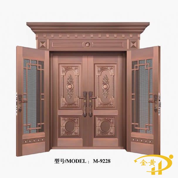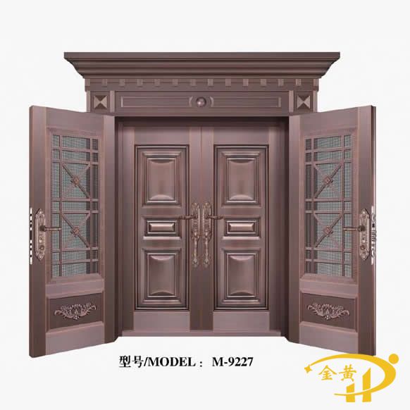 本款雙開復(fù)合銅門,型號是M-9227,門面采用整板模壓工藝,原材料為洛陽純紫銅或黃銅制作而成。
