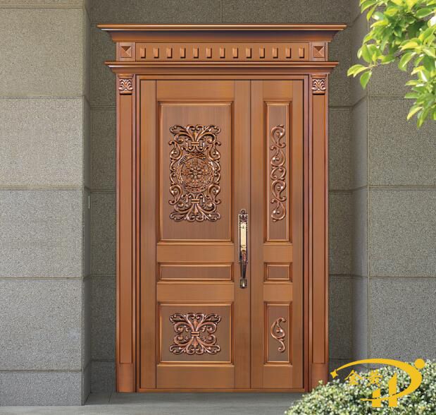 本款子母門(mén)銅門(mén),型號(hào)是M-9170,門(mén)面采用精工拼接工藝,原材料為洛陽(yáng)純紫銅或黃銅制作而成。
